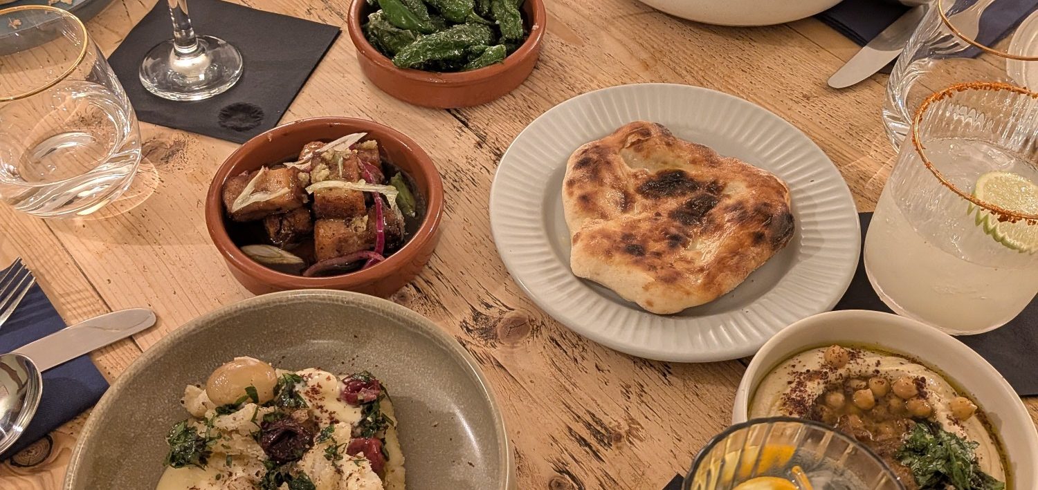 Flatbread, hummus, Padron peppers, olives, Labneh and harissa, pickles